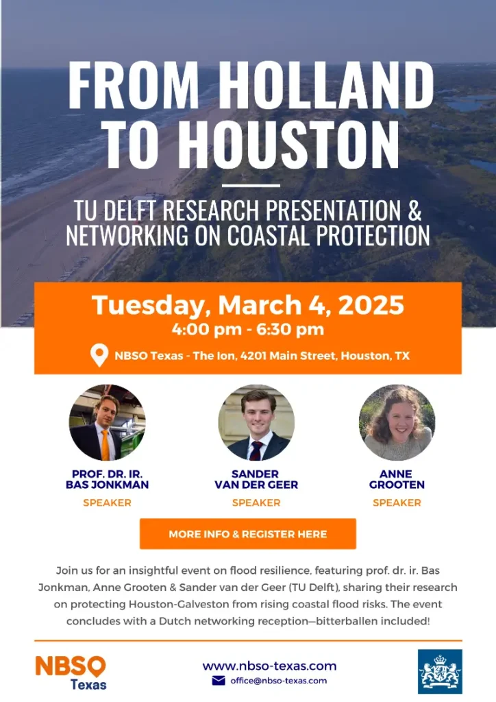 On March 4, we had the pleasure of hosting an insightful event on coastal flood resilience with Professor Bas Jonkman, Sander van der Geer, and Anne Grooten. They shared Dutch best practices and innovative strategies to protect the Houston-Galveston region from rising waters. The event wrapped up with a networking reception, bringing together members of the Dutch community and local stakeholders.