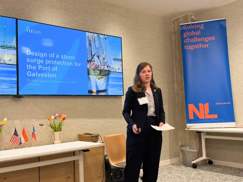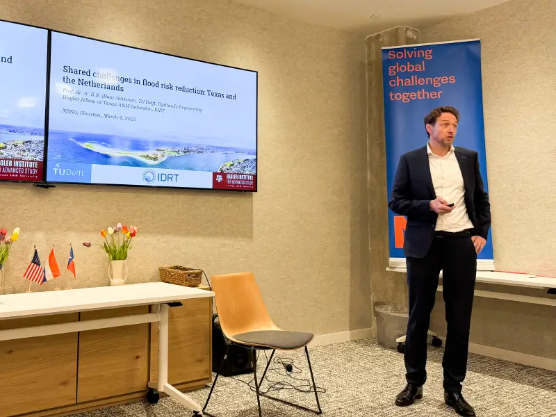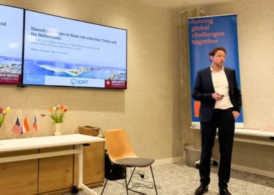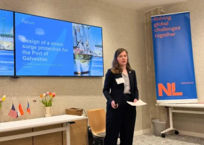 On March 6, we spent a full day of hands-on collaboration at Texas A&M University Galveston, hosted by the Institute for a Disaster Resilient Texas (IDRT). Together with experts from the US Army Corps of Engineers, Texas GLO, and the Gulf Coast Protection District, realistic storm surge barrier designs were explored—incorporating Dutch expertise from TU Delft and Royal HaskoningDHV. A great exchange of ideas focused on this most complex and costly part of the Texas Coastal Protection Plan, with an eye on long-term operations and maintenance.